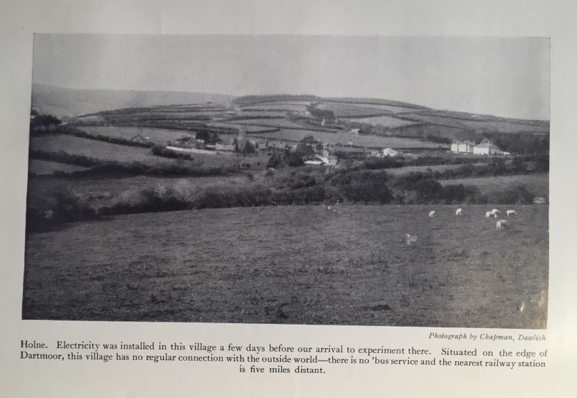 In order to answer these questions, Thomas and the rest of the sub-committee chose to show a series of silent and sound films grouped around the theme of ‘Man and His Environment’. There was significant debate over what films should be screened. Some where of the opinion that ‘the specifically educational film may be of less real educational value than a good feature film’, which might help to extend viewers’ knowledge and experience in more indirect ways. A feature film may not have offered much in the way of science education, for instaqnce, but it might serve to educate rural viewers about cinema. Some were doubtful about the value of showing Secrets of Nature films to rural audiences: ‘Why, therefore, use films illustrating the already existing experience of the countryman, depicting “Secrets of Nature” already divulged to him?’. Thomas shared these views in part, and viewed the countryside in pastoral terms, depicting the cinema as a modern technology breaking through to rural society for the first time, much like Leo Marx’s ‘Machine in the Garden’. One of the images included in the report shows the village of Holne, followed by the caption: ‘Electricity was installed in this village a few days before our arrival’.