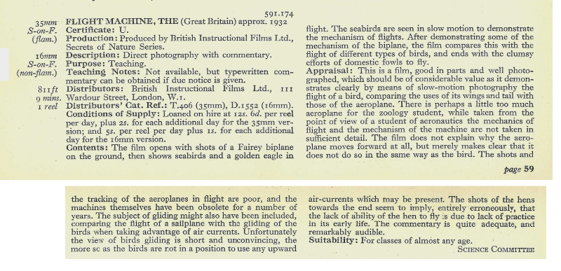 The Flight Machine was one of the Secrets films which was advertised as being ‘viewed and approved’ by the Commission on Educational and Cultural Films, whose landmark report The Film in National Life (1932) surveyed the state of British cinema and recommended the establishment of the British Film Institute. In this respect, The Flight Machine was meant to serve as an example of how film could be used as a medium foorr education. The film was used in multiple experiments and demonstrations, including the Middlesex Experiment, which aimed to test the reactions of schoolchildren to educational films. In the 1931 report of the experiment, Sound Films in Schools, the following was said of The Flight Machine:
