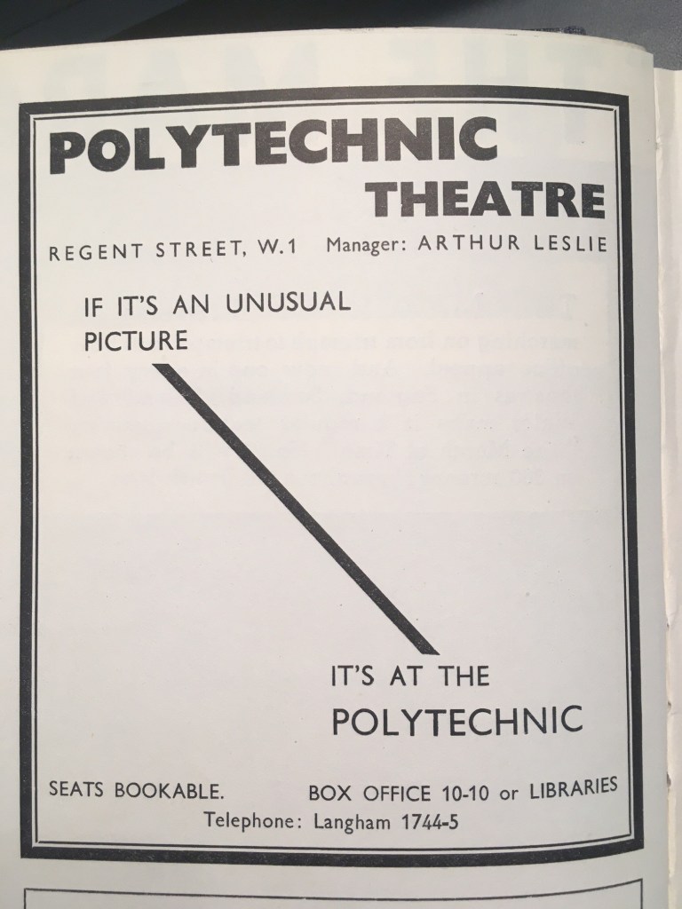 Something else that I found in World Film News were several adverts for cinemas that were established solely for showing non-theatrical films. I thought I would quickly share three of these adverts, and a little bit of context about the cinemas in question: The Polytechnic, the Tatler, and the Imperial Institute. All three are a reminder of the fact that non-fiction films continued to enjoy a loyal audience, even after the introduction of the 1927 Cinematograph Act and its associated ‘quota’ for British films, which had the effect of driving shorts out of many cinema programmes by encouraging the ‘double bill’ format. Although firmly outside of the mainstream, the existence of these specialised cinemas shines a light on one of several ‘contexts’ in which Secrets films were screened. Update: I have added to this post details about a fourth important non-theatrical cinema in the history of the Secrets, the Embassy Theatre in Holborn.