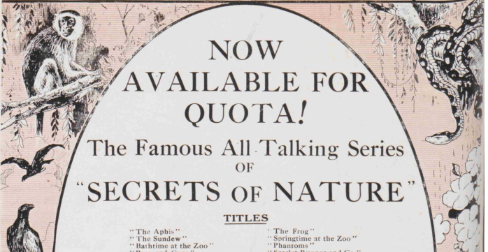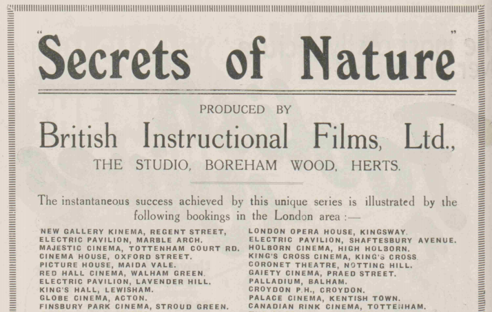 These newspaper cuttings from the British Newspaper Archive give us a sense of the different contexts in which the Secrets were exhibited. For instance, we learn that in 1926 The Life of a Plant was shown as part of a variety show at the Chiswick Empire in London, while in 1930, Playtime at the Zoo was part of a ‘supporting programme’ to a film called His First Command, alongside a Disney Silly Symphony.